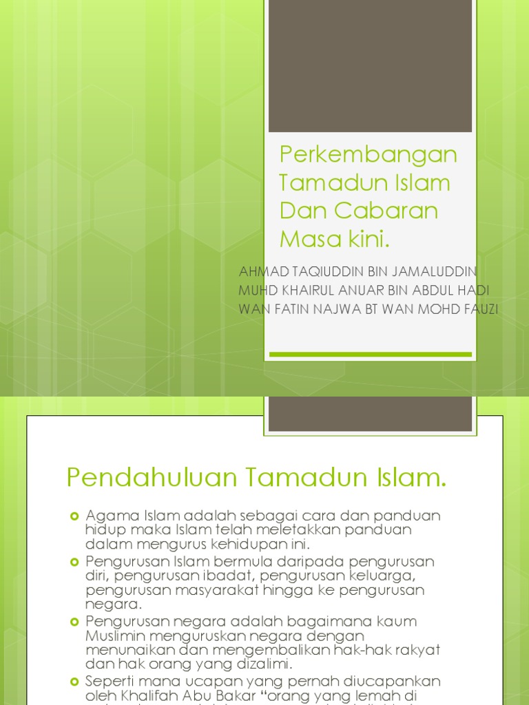 Zaman Kerajaan Abbasiyah adalah zaman kemuncak bagi kegemilangan tamadun. 07122015 Tamadun Islam lahir di kawasan padang pasir yang kontang. 29 Muhammad Asyraf Bin Mohd Yaman UK32563 PERKEMBANGAN TAMADUN ISLAM Setiap tamadun mempunyai zaman kemuncaknya yang tersendiri di era pemerintahan merekaPada zaman tersebut banyak pembaharuan yag dilakukan dalam pelagai bidang seperti pentadbiranpendidikanekonomi dan banyak lagiTamadun Islam juga tidak terkecualiTamadun Islam yang.